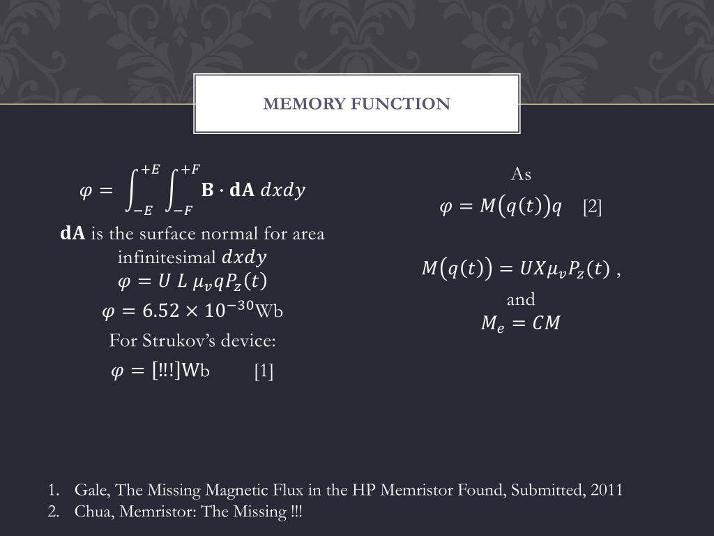 Memory FuNction • is the surface normal for area infinitesimal • Wb • For Strukov’s device: • b [1] • As • [2] • , • and Gale, The Missing Magnetic Flux in the HP Memristor Found, Submitted, 2011 Chua, Memristor: The Missing !!!