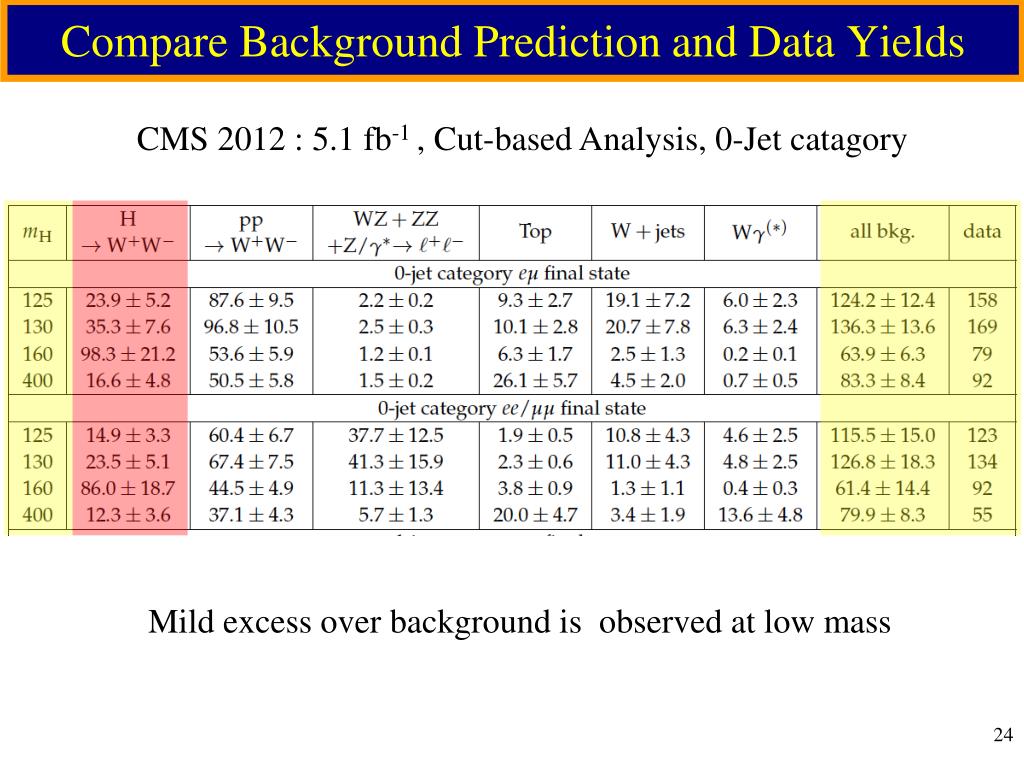 Compare Background Prediction and Data Yields CMS 2012 : 5.1 fb-1 , Cut-based Analysis, 0-Jet catagory Mild excess over background is observed at low mass