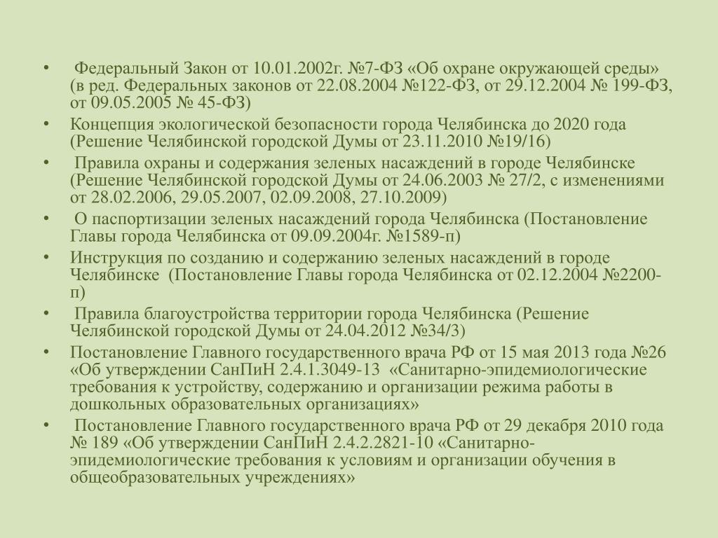 Федеральный Закон от 10.01.2002г. №7-ФЗ «Об охране окружающей среды» (в ред. Федеральных законов от 22.08.2004 №122-ФЗ, от 29.12.2004 № 199-ФЗ, от 09.05.2005 № 45-ФЗ) • Концепция экологической безопасности города Челябинска до 2020 года (Решение Челябинской городской Думы от 23.11.2010 №19/16) • Правила охраны и содержания зеленых насаждений в городе Челябинске (Решение Челябинской городской Думы от 24.06.2003 № 27/2, с изменениями от 28.02.2006, 29.05.2007, 02.09.2008, 27.10.2009) • О паспортизации зеленых насаждений города Челябинска (Постановление Главы города Челябинска от 09.09.2004г. №1589-п) • Инструкция по созданию и содержанию зеленых насаждений в городе Челябинске (Постановление Главы города Челябинска от 02.12.2004 №2200-п) • Правила благоустройства территории города Челябинска (Решение Челябинской городской Думы от 24.04.2012 №34/3) • Постановление Главного государственного врача РФ от 15 мая 2013 года №26 «Об утверждении СанПиН 2.4.1.3049-13 «Санитарно-эпидемиологические требования к устройству, содержанию и организации режима работы в дошкольных образовательных организациях» • Постановление Главного государственного врача РФ от 29 декабря 2010 года № 189 «Об утверждении СанПиН 2.4.2.2821-10 «Санитарно-эпидемиологические требования к условиям и организации обучения в общеобразовательных учреждениях»