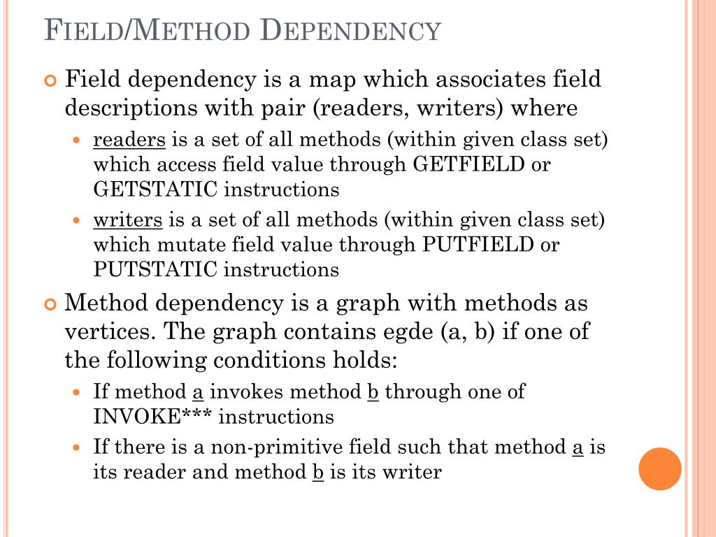 Field/Method Dependency • Field dependency is a map which associates field descriptions with pair (readers, writers) where • readers is a set of all methods (within given class set) which access field value through GETFIELD or GETSTATIC instructions • writers is a set of all methods (within given class set) which mutate field value through PUTFIELD or PUTSTATIC instructions • Method dependency is a graph with methods as vertices. The graph contains egde (a, b) if one of the following conditions holds: • If method a invokes method b through one of INVOKE*** instructions • If there is a non-primitive field such that method a is its reader and method b is its writer