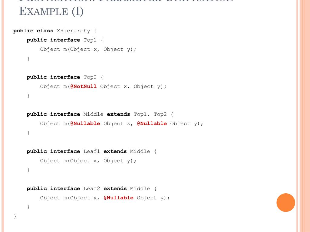 Propagation: Parameter Unification Example (I) publicclassXHierarchy{ publicinterface Top1 { Object m(Object x, Object y); } publicinterface Top2 { Object m(@NotNull Object x, Object y); } publicinterface Middle extends Top1, Top2 { Object m(@Nullable Object x, @NullableObject y); } publicinterface Leaf1 extends Middle { Object m(Object x, Object y); } publicinterface Leaf2 extends Middle { Object m(Object x, @NullableObject y); } }