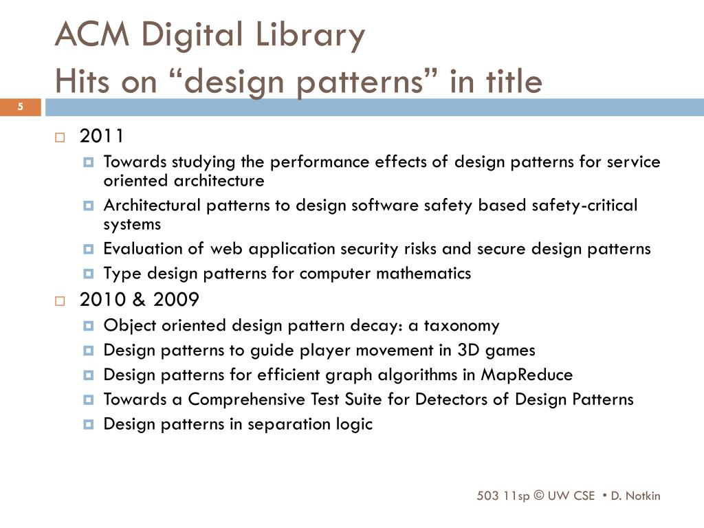 ACM Digital LibraryHits on “design patterns” in title • 2011 • Towards studying the performance effects of design patterns for service oriented architecture • Architectural patterns to design software safety based safety-critical systems • Evaluation of web application security risks and secure design patterns • Type design patterns for computer mathematics • 2010 & 2009 • Object oriented design pattern decay: a taxonomy • Design patterns to guide player movement in 3D games • Design patterns for efficient graph algorithms in MapReduce • Towards a Comprehensive Test Suite for Detectors of Design Patterns • Design patterns in separation logic