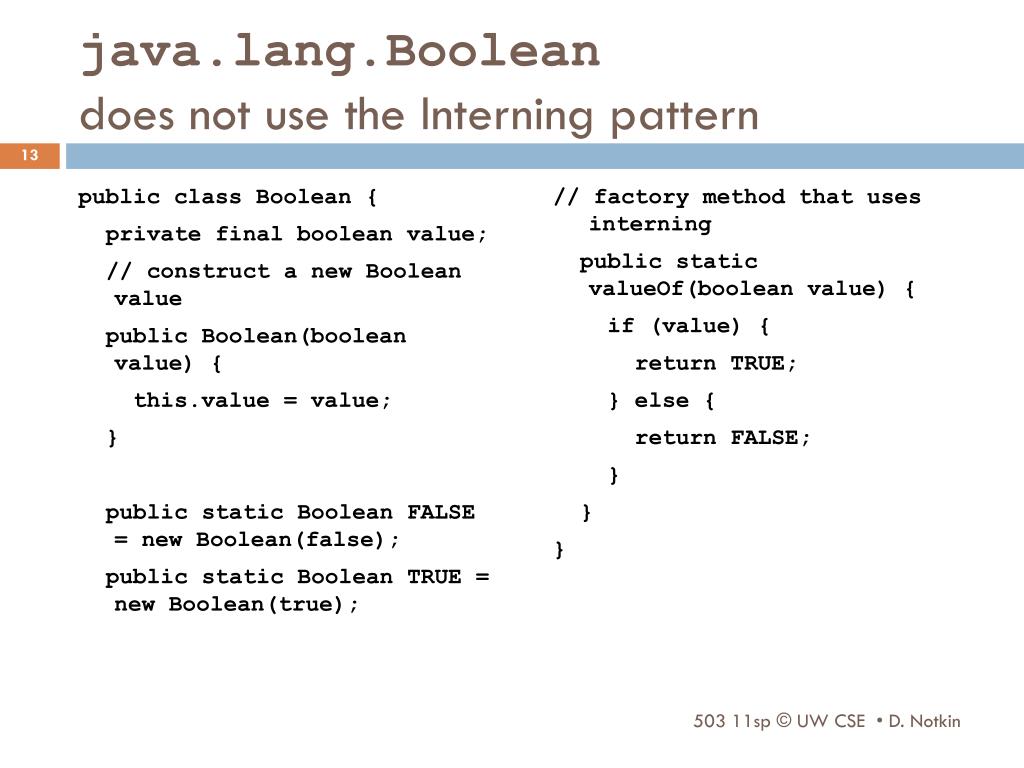 java.lang.Booleandoes not use the Interning pattern public class Boolean { private final boolean value; // construct a new Boolean value public Boolean(boolean value) { this.value = value; } public static Boolean FALSE = new Boolean(false); public static Boolean TRUE = new Boolean(true); // factory method that uses interning public static valueOf(boolean value) { if (value) { return TRUE; } else { return FALSE; } } }