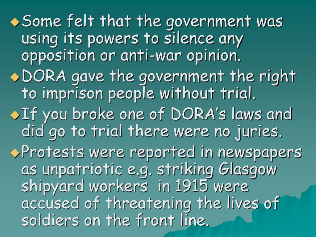Some felt that the government was using its powers to silence any opposition or anti-war opinion. • DORA gave the government the right to imprison people without trial. • If you broke one of DORA’s laws and did go to trial there were no juries. • Protests were reported in newspapers as unpatriotic e.g. striking Glasgow shipyard workers in 1915 were accused of threatening the lives of soldiers on the front line.