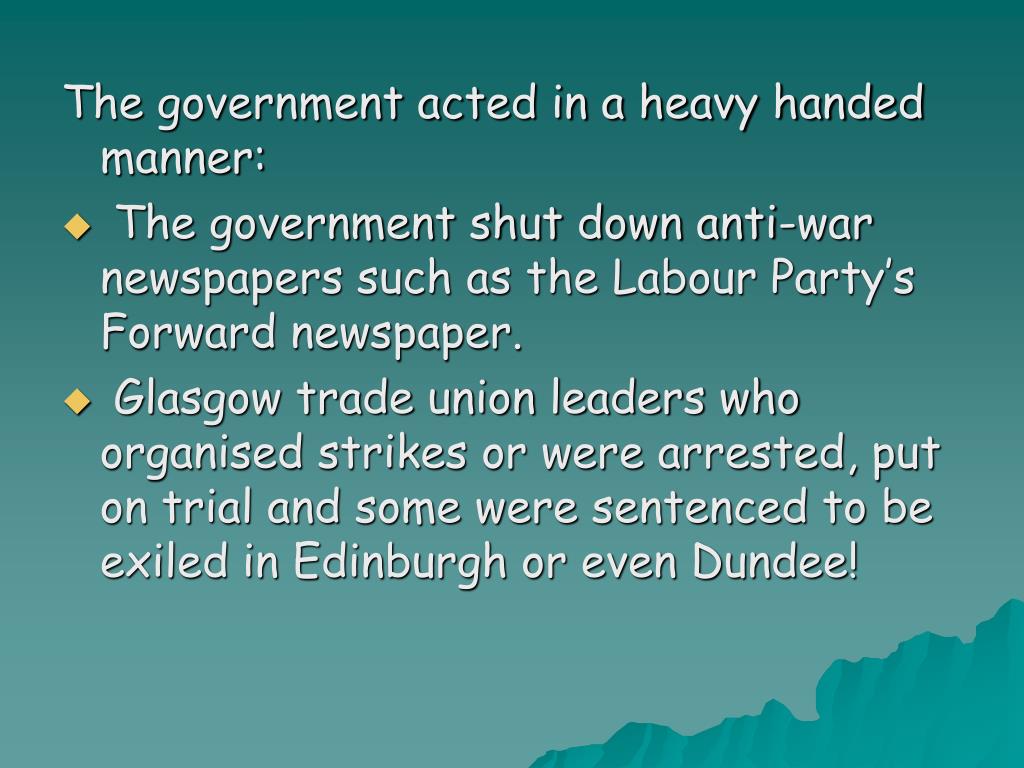 The government acted in a heavy handed manner: • The government shut down anti-war newspapers such as the Labour Party’s Forward newspaper. • Glasgow trade union leaders who organised strikes or were arrested, put on trial and some were sentenced to be exiled in Edinburgh or even Dundee!