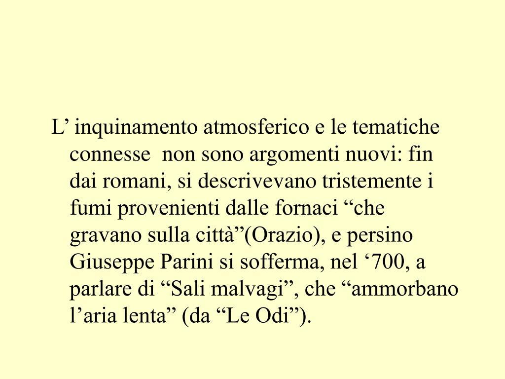 L’ inquinamento atmosferico e le tematiche connesse non sono argomenti nuovi: fin dai romani, si descrivevano tristemente i fumi provenienti dalle fornaci “che gravano sulla città”(Orazio), e persino Giuseppe Parini si sofferma, nel ‘700, a parlare di “Sali malvagi”, che “ammorbano l’aria lenta” (da “Le Odi”).