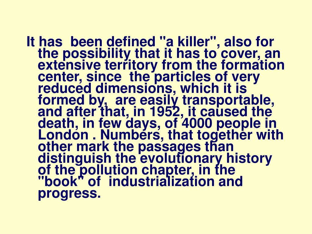 It has been defined "a killer", also for the possibility that it has to cover, an extensive territory from the formation center, since the particles of very reduced dimensions, which it is formed by, are easily transportable, and after that, in 1952, it caused the death, in few days, of 4000 people in London . Numbers, that together with other mark the passages than distinguish the evolutionary history of the pollution chapter, in the "book" of industrialization and progress.