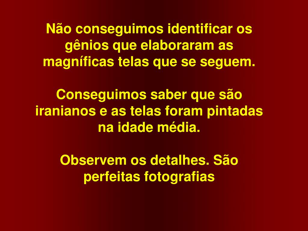 Não conseguimos identificar os gênios que elaboraram as magníficas telas que se seguem. Conseguimos saber que são iranianos e as telas foram pintadas na idade média. Observem os detalhes. São perfeitas fotografias