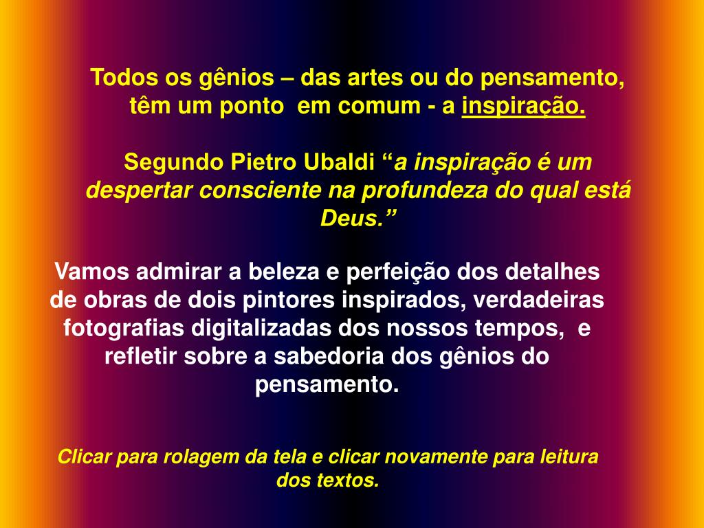 Todos os gênios – das artes ou do pensamento, têm um ponto em comum - a inspiração. Segundo Pietro Ubaldi “a inspiração é um despertar consciente na profundeza do qual está Deus.” Vamos admirar a beleza e perfeição dos detalhes de obras de dois pintores inspirados, verdadeiras fotografias digitalizadas dos nossos tempos, e refletir sobre a sabedoria dos gênios do pensamento. Clicar para rolagem da tela e clicar novamente para leitura dos textos.