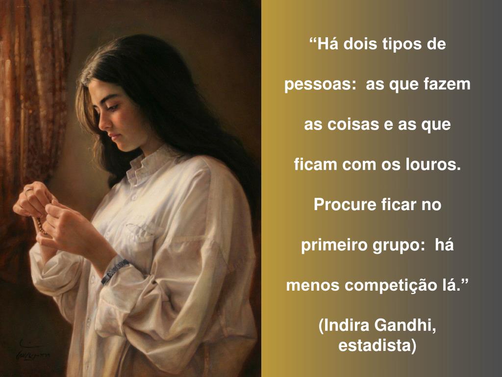 “Há dois tipos de pessoas: as que fazem as coisas e as que ficam com os louros. Procure ficar no primeiro grupo: há menos competição lá.” (Indira Gandhi, estadista)