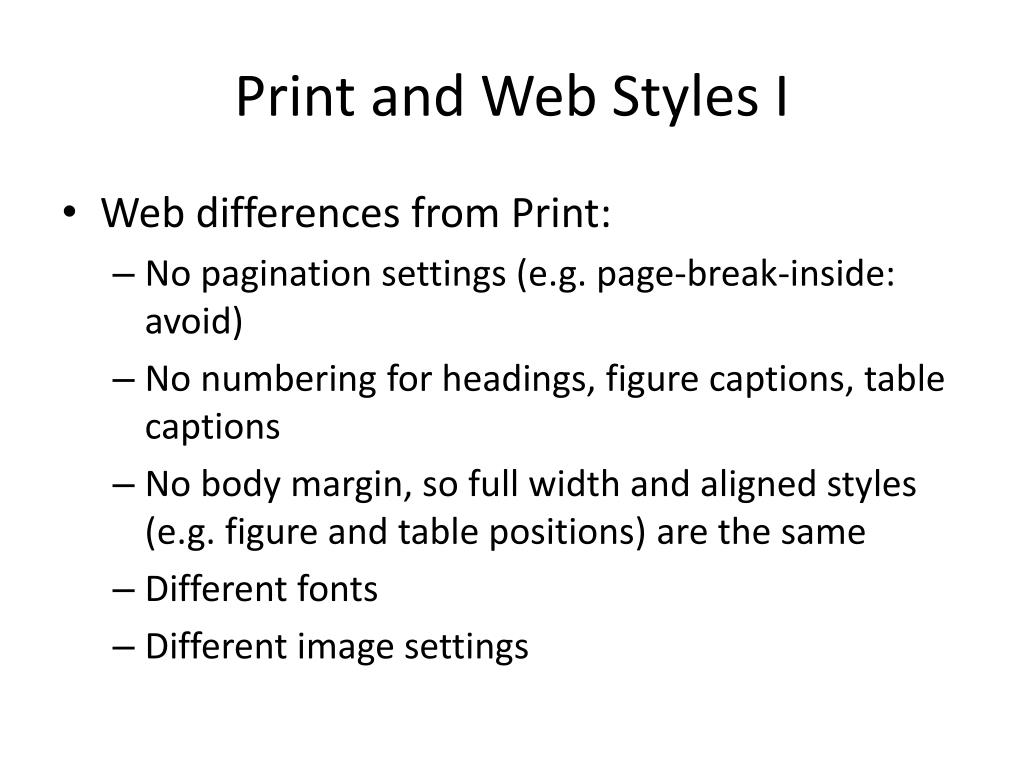Print and Web Styles I • Web differences from Print: • No pagination settings (e.g. page-break-inside: avoid) • No numbering for headings, figure captions, table captions • No body margin, so full width and aligned styles (e.g. figure and table positions) are the same • Different fonts • Different image settings