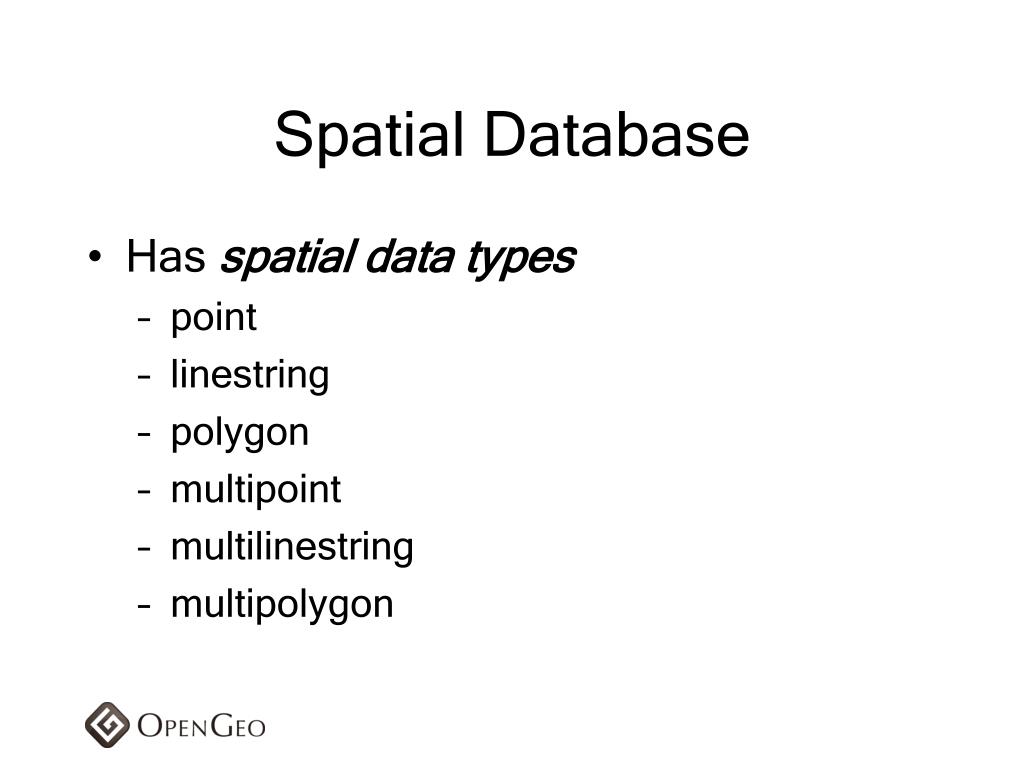 Spatial Database • Has spatial data types • point • linestring • polygon • multipoint • multilinestring • multipolygon