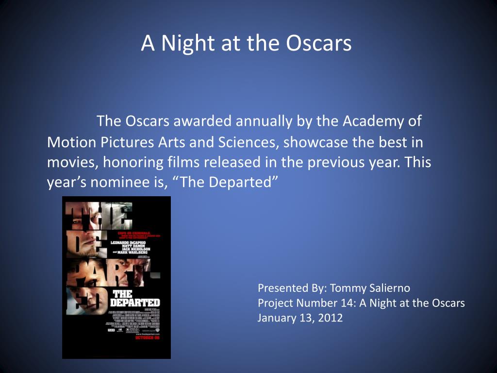 A Night at the Oscars The Oscars awarded annually by the Academy of Motion Pictures Arts and Sciences, showcase the best in movies, honoring films released in the previous year. This year’s nominee is, “The Departed” Presented By: Tommy Salierno Project Number 14: A Night at the Oscars January 13, 2012