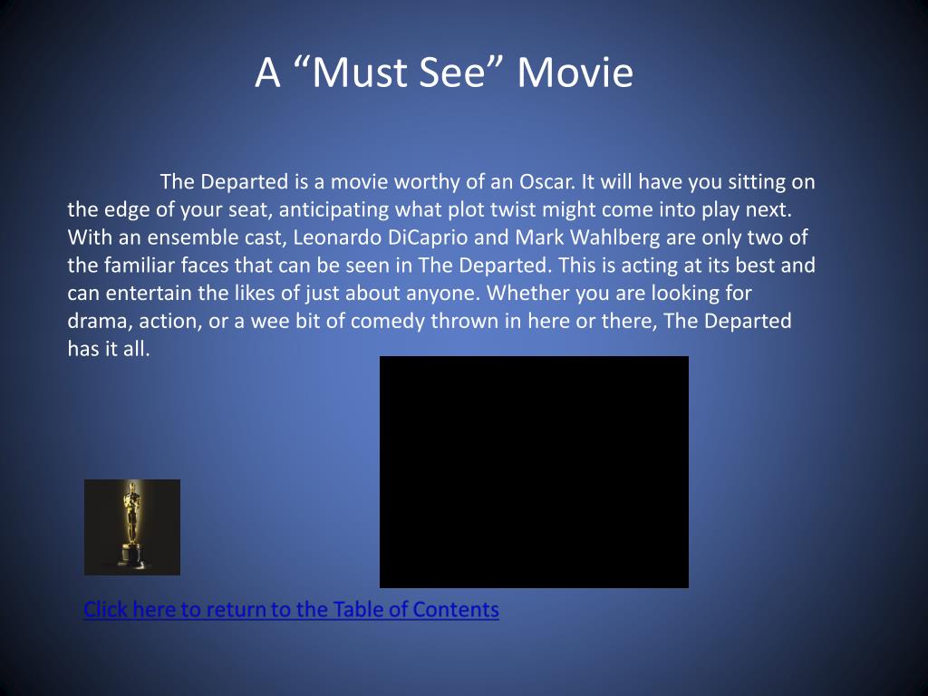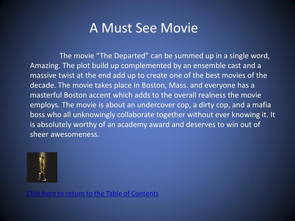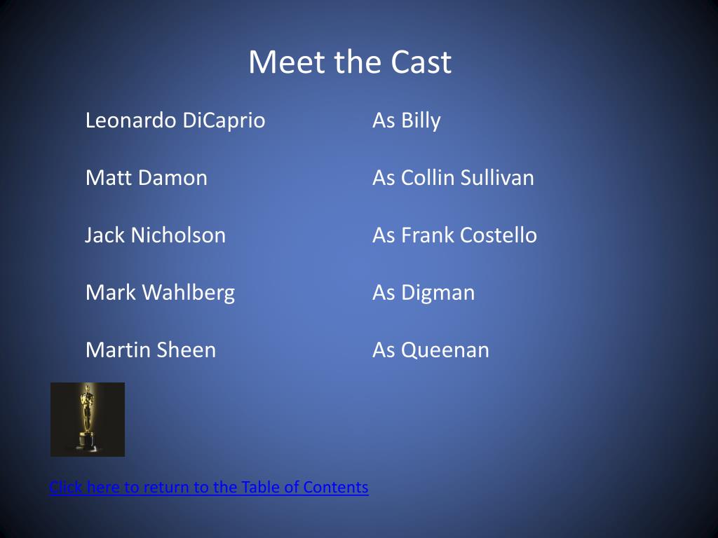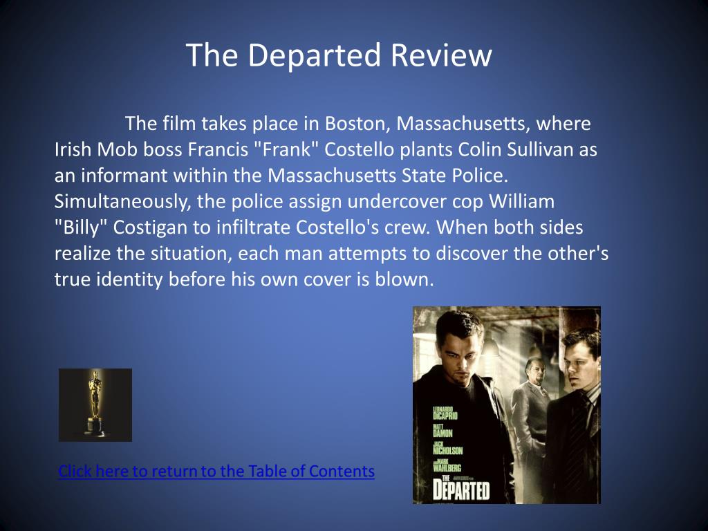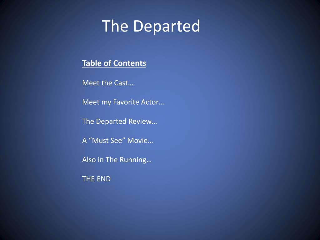 The Departed Table of Contents Meet the Cast… Meet my Favorite Actor… The Departed Review… A “Must See” Movie… Also in The Running… THE END