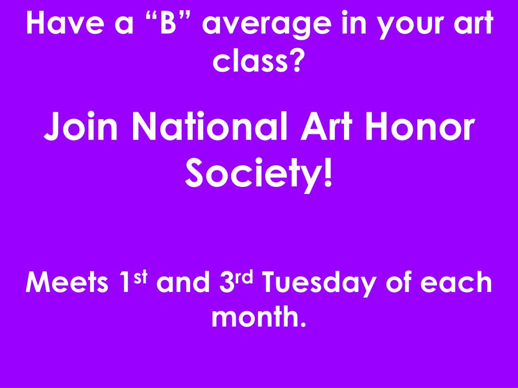 Have a “B” average in your art class? Join National Art Honor Society! Meets 1st and 3rd Tuesday of each month.