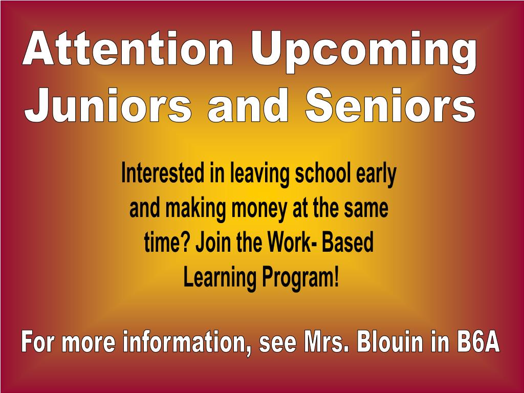 Attention Upcoming Juniors and Seniors Interested in leaving school early and making money at the same time? Join the Work- Based Learning Program! For more information, see Mrs. Blouin in B6A