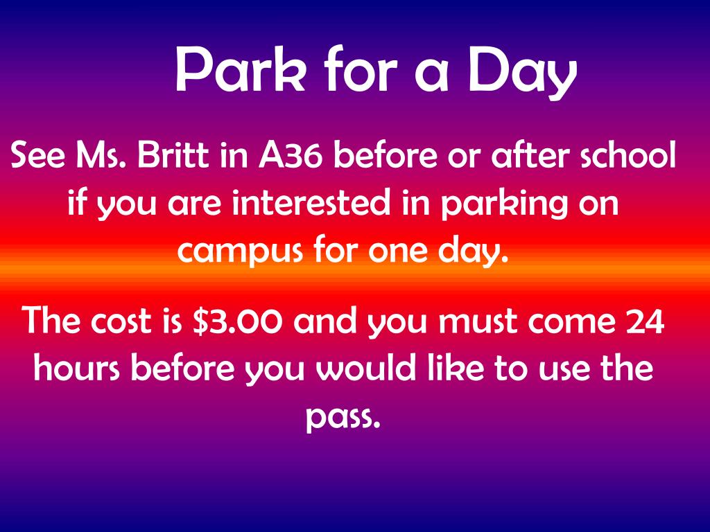 Park for a Day See Ms. Britt in A36 before or after school if you are interested in parking on campus for one day. The cost is $3.00 and you must come 24 hours before you would like to use the pass.