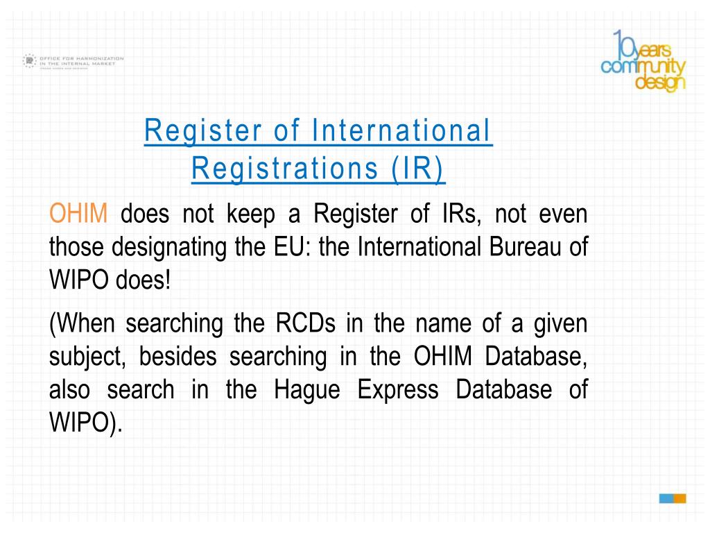 Register of International Registrations (IR) OHIMdoes not keep a Register of IRs, not eventhosedesignating the EU: the International Bureau of WIPO does! (Whensearching the RCDs in the name of a given subject, besidessearching in the OHIM Database, alsosearch in the Hague Express Database of WIPO).
