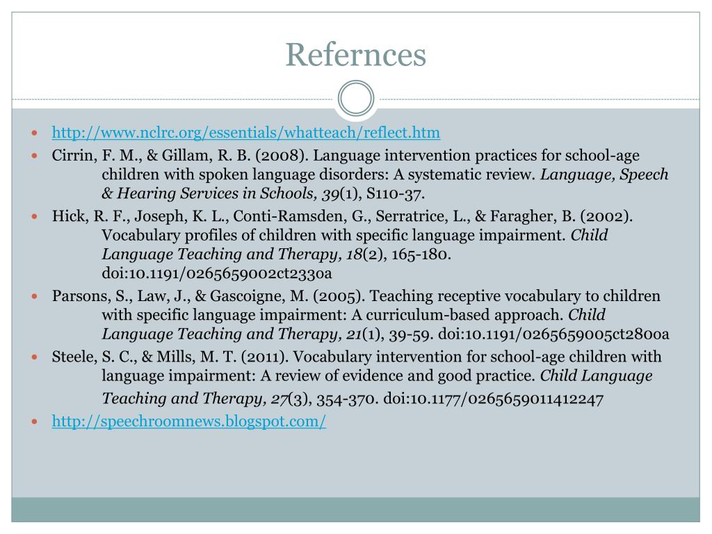 Refernces http://www.nclrc.org/essentials/whatteach/reflect.htm Cirrin, F. M., & Gillam, R. B. (2008). Language intervention practices for school-age children with spoken language disorders: A systematic review. Language, Speech & Hearing Services in Schools, 39(1), S110-37. Hick, R. F., Joseph, K. L., Conti-Ramsden, G., Serratrice, L., & Faragher, B. (2002). Vocabulary profiles of children with specific language impairment. Child Language Teaching and Therapy, 18(2), 165-180. doi:10.1191/0265659002ct233oa Parsons, S., Law, J., & Gascoigne, M. (2005). Teaching receptive vocabulary to children with specific language impairment: A curriculum-based approach. Child Language Teaching and Therapy, 21(1), 39-59. doi:10.1191/0265659005ct280oa Steele, S. C., & Mills, M. T. (2011). Vocabulary intervention for school-age children with language impairment: A review of evidence and good practice. Child Language Teaching and Therapy, 27(3), 354-370. doi:10.1177/0265659011412247 http://speechroomnews.blogspot.com/