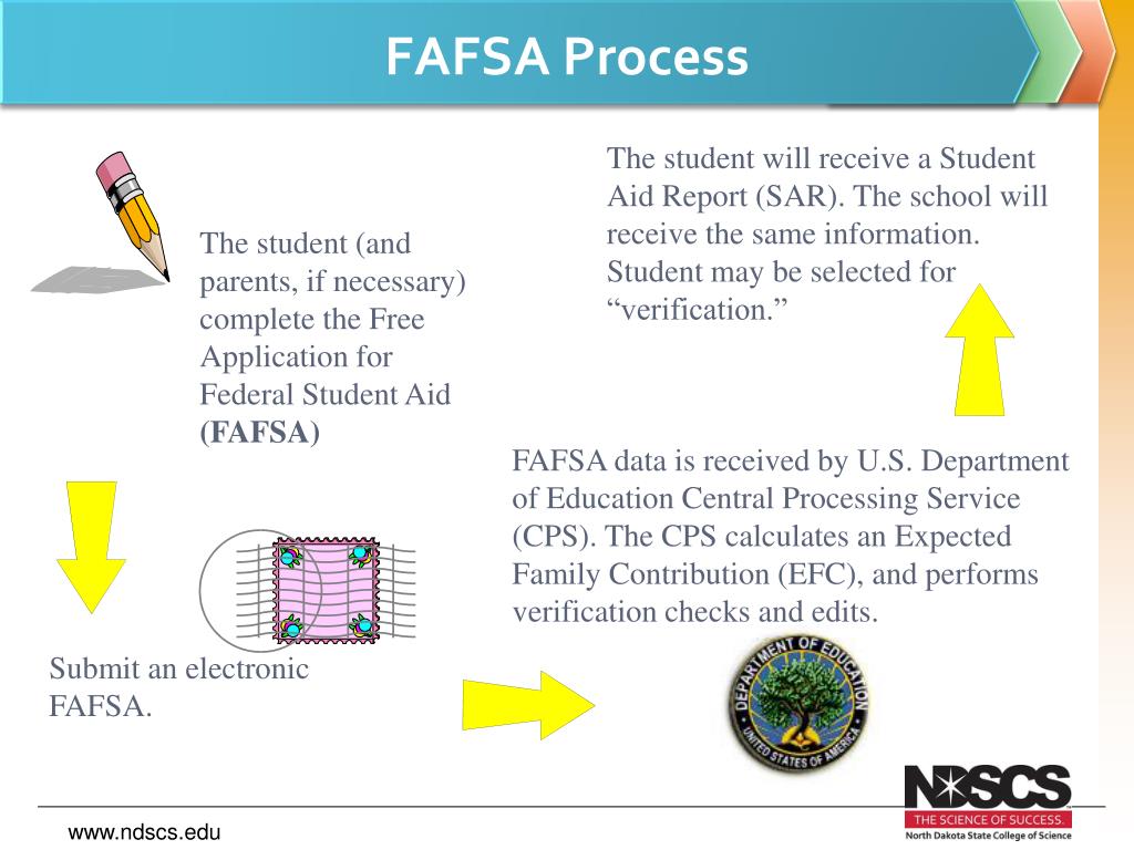 The student (and parents, if necessary) complete the Free Application for Federal Student Aid (FAFSA) Submit an electronic FAFSA. FAFSA Process The student will receive a Student Aid Report (SAR). The school will receive the same information. Student may be selected for “verification.” FAFSA data is received by U.S. Department of Education Central Processing Service (CPS). The CPS calculates an Expected Family Contribution (EFC), and performs verification checks and edits.