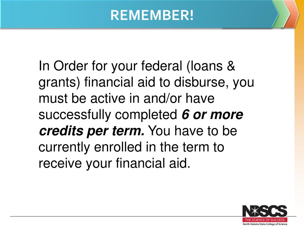 REMEMBER! In Order for your federal (loans & grants) financial aid to disburse, you must be active in and/or have successfully completed 6 or more credits per term. You have to be currently enrolled in the term to receive your financial aid.