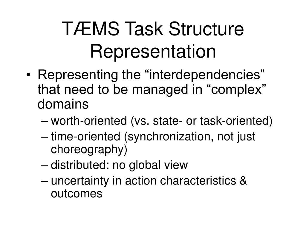 TÆMS Task Structure Representation • Representing the “interdependencies” that need to be managed in “complex” domains • worth-oriented (vs. state- or task-oriented) • time-oriented (synchronization, not just choreography) • distributed: no global view • uncertainty in action characteristics & outcomes