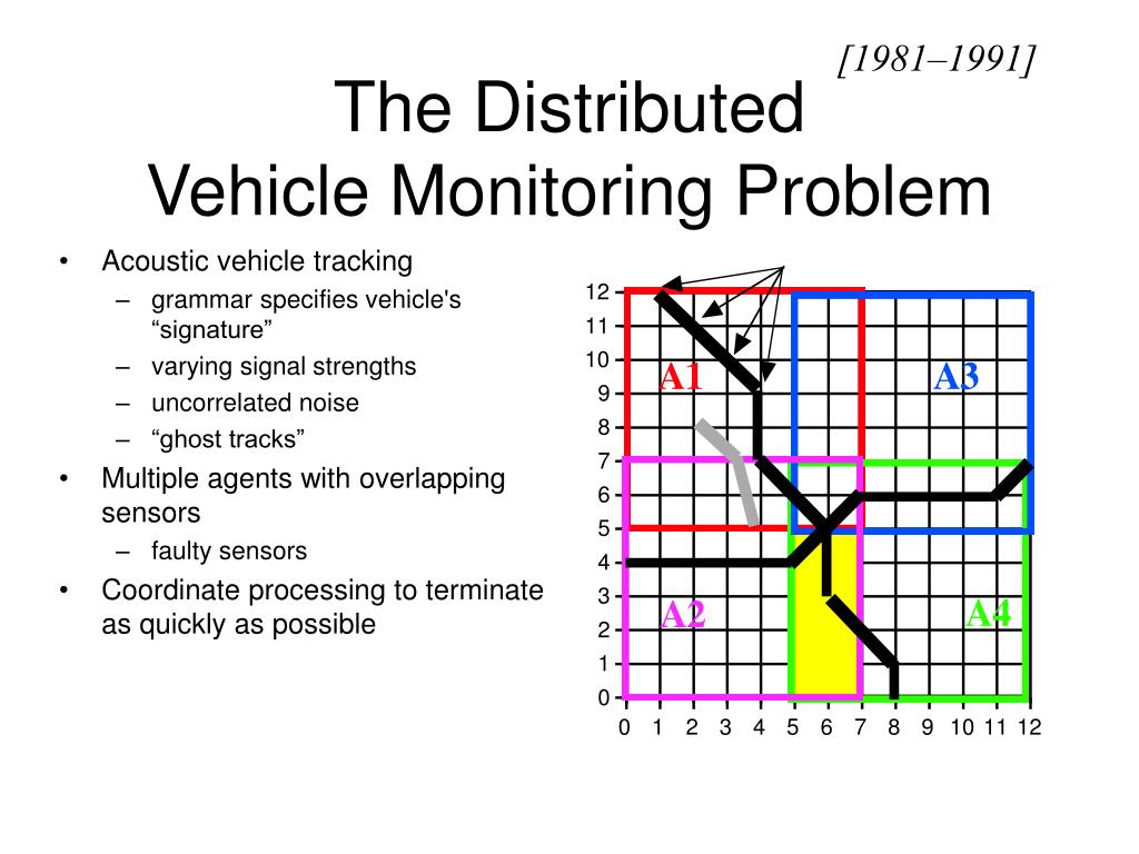 [1981–1991] The Distributed Vehicle Monitoring Problem • Acoustic vehicle tracking • grammar specifies vehicle's “signature” • varying signal strengths • uncorrelated noise • “ghost tracks” • Multiple agents with overlapping sensors • faulty sensors • Coordinate processing to terminate as quickly as possible