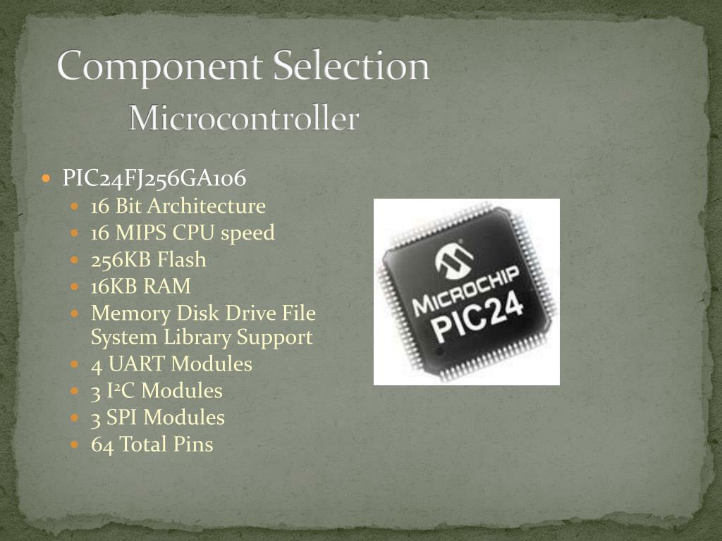 Component SelectionMicrocontroller • PIC24FJ256GA106 • 16 Bit Architecture • 16 MIPS CPU speed • 256KB Flash • 16KB RAM • Memory Disk Drive File System Library Support • 4 UART Modules • 3 I2C Modules • 3 SPI Modules • 64 Total Pins