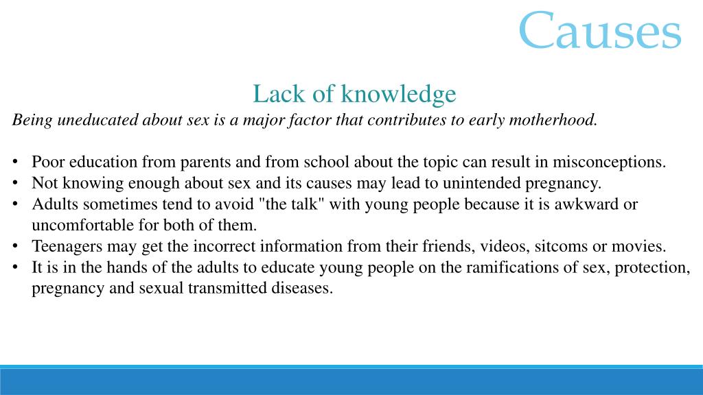 Causes • Lack of knowledge • Being uneducated about sex is a major factor that contributes to early motherhood. • Poor education from parents and from school about the topic can result in misconceptions. • Not knowing enough about sex and its causes may lead to unintended pregnancy. • Adults sometimes tend to avoid "the talk" with young people because it is awkward or uncomfortable for both of them. • Teenagers may get the incorrect information from their friends, videos, sitcoms or movies. • It is in the hands of the adults to educate young people on the ramifications of sex, protection, pregnancy and sexual transmitted diseases.