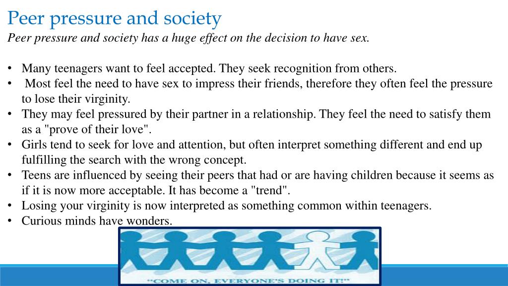 Peer pressure and society • Peer pressure and society has a huge effect on the decision to have sex. • Many teenagers want to feel accepted. They seek recognition from others. • Most feel the need to have sex to impress their friends, therefore they often feel the pressure to lose their virginity. • They may feel pressured by their partner in a relationship. They feel the need to satisfy them as a "prove of their love". • Girls tend to seek for love and attention, but often interpret something different and end up fulfilling the search with the wrong concept. • Teens are influenced by seeing their peers that had or are having children because it seems as if it is now more acceptable. It has become a "trend". • Losing your virginity is now interpreted as something common within teenagers. • Curious minds have wonders.