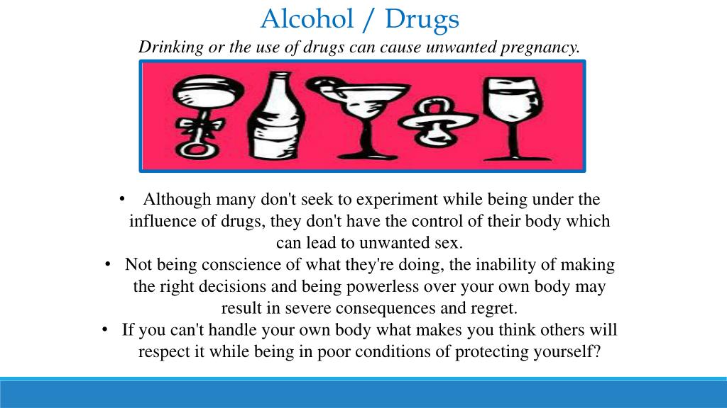 Alcohol / Drugs • Drinking or the use of drugs can cause unwanted pregnancy. • Although many don't seek to experiment while being under the influence of drugs, they don't have the control of their body which can lead to unwanted sex. • Not being conscience of what they're doing, the inability of making the right decisions and being powerless over your own body may result in severe consequences and regret. • If you can't handle your own body what makes you think others will respect it while being in poor conditions of protecting yourself?