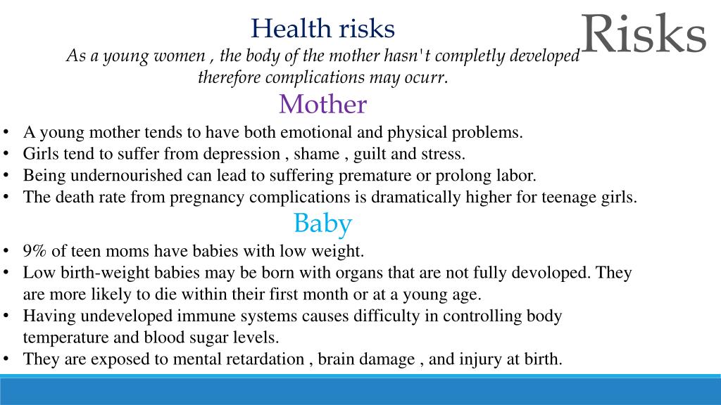 Risks • Health risks • As a young women , the body of the mother hasn't completly developed • therefore complications may ocurr. • Mother • A young mother tends to have both emotional and physical problems. • Girls tend to suffer from depression , shame , guilt and stress. • Being undernourished can lead to suffering premature or prolong labor. • The death rate from pregnancy complications is dramatically higher for teenage girls. • Baby • 9% of teen moms have babies with low weight. • Low birth-weight babies may be born with organs that are not fully devoloped. They are more likely to die within their first month or at a young age. • Having undeveloped immune systems causes difficulty in controlling body temperature and blood sugar levels. • They are exposed to mental retardation , brain damage , and injury at birth.