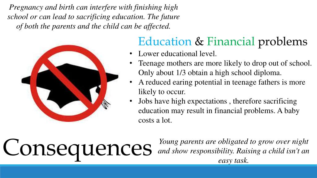 Pregnancy and birth can interfere with finishing high school or can lead to sacrificing education. The future of both the parents and the child can be affected. • Education &Financial problems • Lower educational level. • Teenage mothers are more likely to drop out of school. Only about 1/3 obtain a high school diploma. • A reduced earing potential in teenage fathers is more likely to occur. • Jobs have high expectations , therefore sacrificing education may result in financial problems. A baby costs a lot. Consequences Young parents are obligated to grow over night and show responsibility. Raising a child isn't an easy task.
