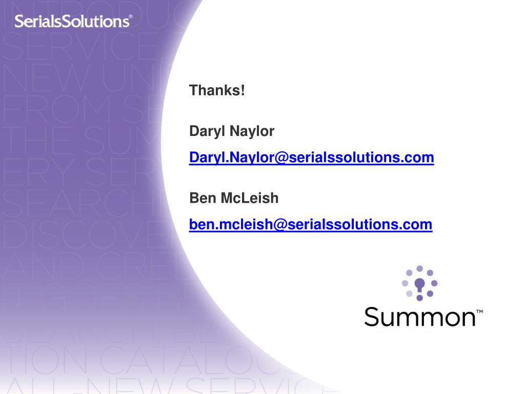 Thanks!Daryl NaylorDaryl.Naylor@serialssolutions.comBen McLeishben.mcleish@serialssolutions.com