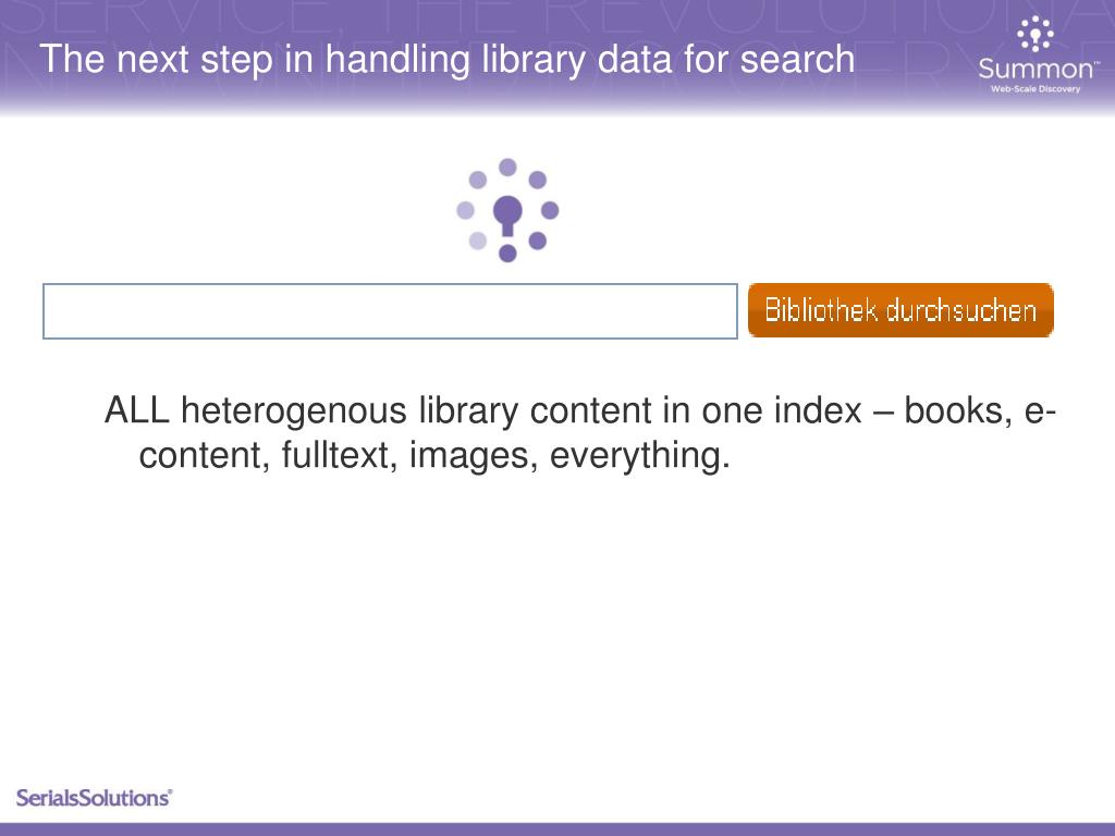 The next step in handling library data for search ALL heterogenous library content in one index – books, e-content, fulltext, images, everything.