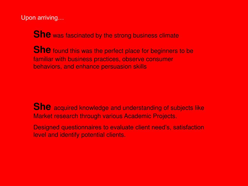 Upon arriving… She was fascinated by the strong business climate She found this was the perfect place for beginners to be familiar with business practices, observe consumer behaviors, and enhance persuasion skills She acquired knowledge and understanding of subjects like Market research through various Academic Projects. Designed questionnaires to evaluate client need’s, satisfaction level and identify potential clients.