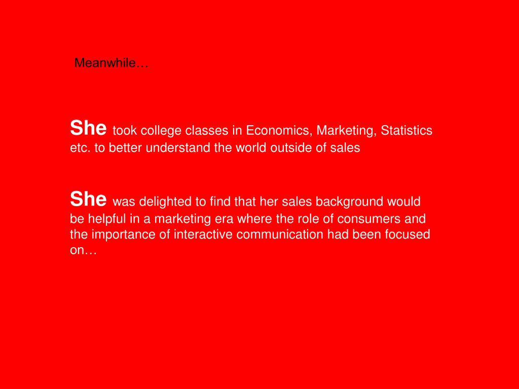 Meanwhile… She took college classes in Economics, Marketing, Statistics etc. to better understand the world outside of sales She was delighted to find that her sales background would be helpful in a marketing era where the role of consumers and the importance of interactive communication had been focused on…