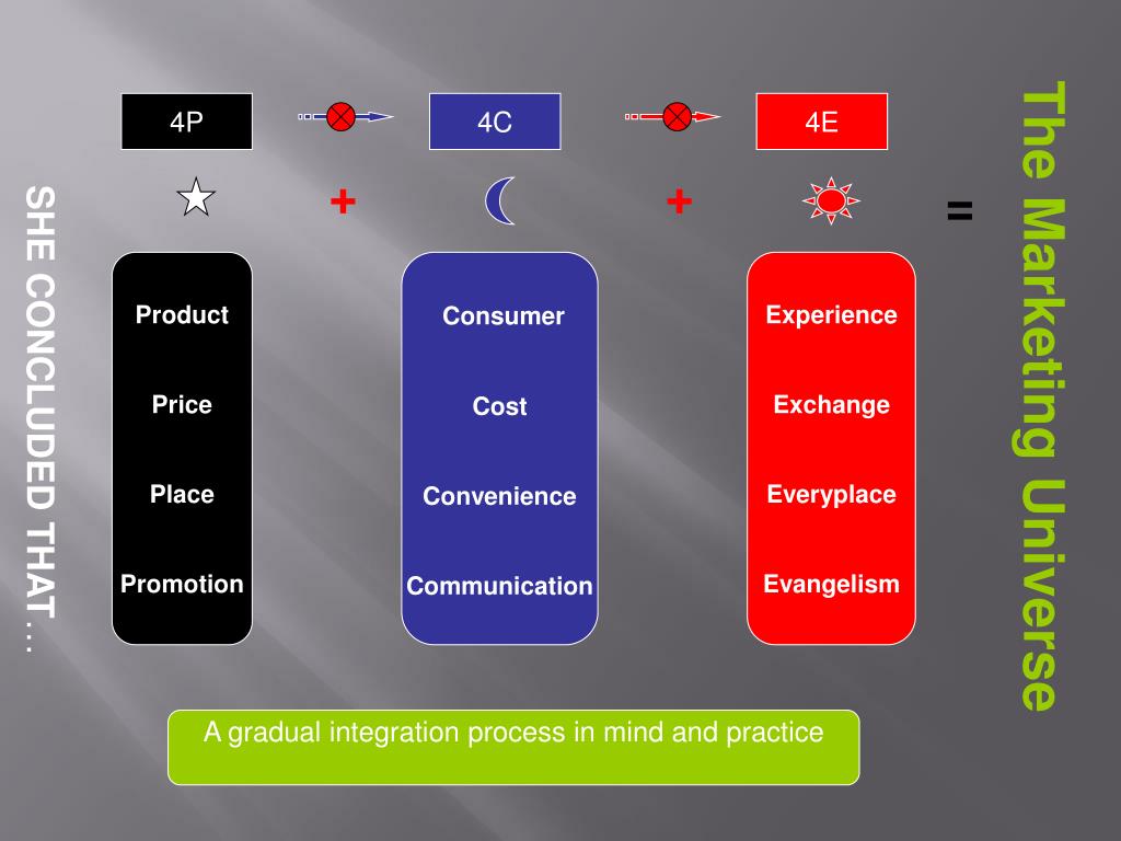 The Marketing Universe 4P 4C 4E SHE CONCLUDED THAT… + + = Product Price Place Promotion Consumer Cost Convenience Communication Experience Exchange Everyplace Evangelism A gradual integration process in mind and practice