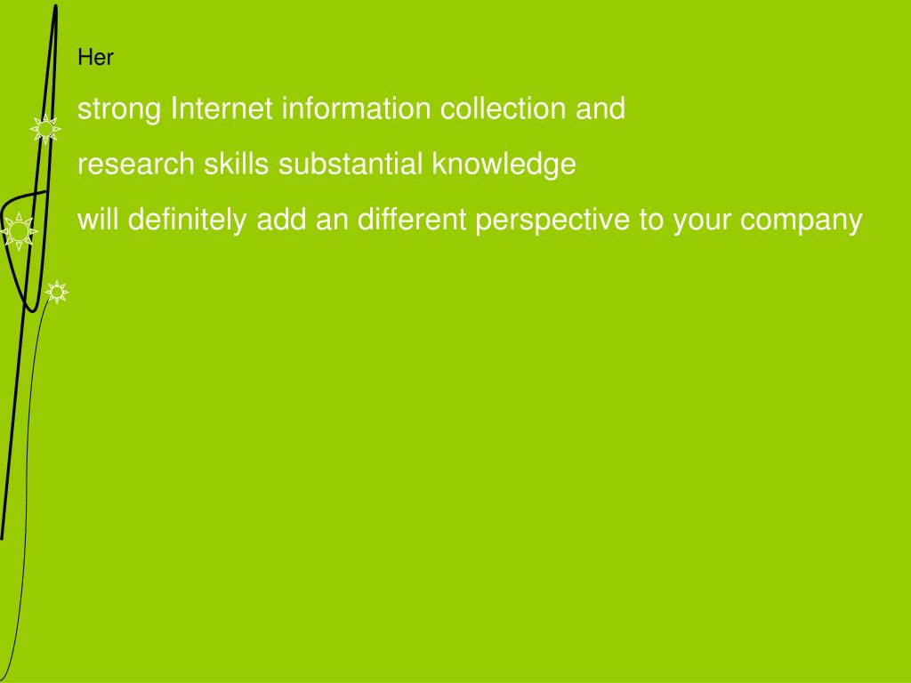 Her strong Internet information collection and research skills substantial knowledge will definitely add an different perspective to your company