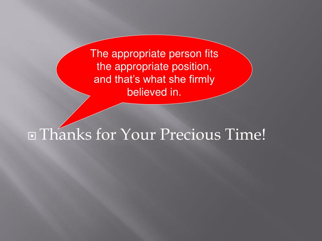 The appropriate person fits the appropriate position, and that’s what she firmly believed in. • Thanks for Your Precious Time!