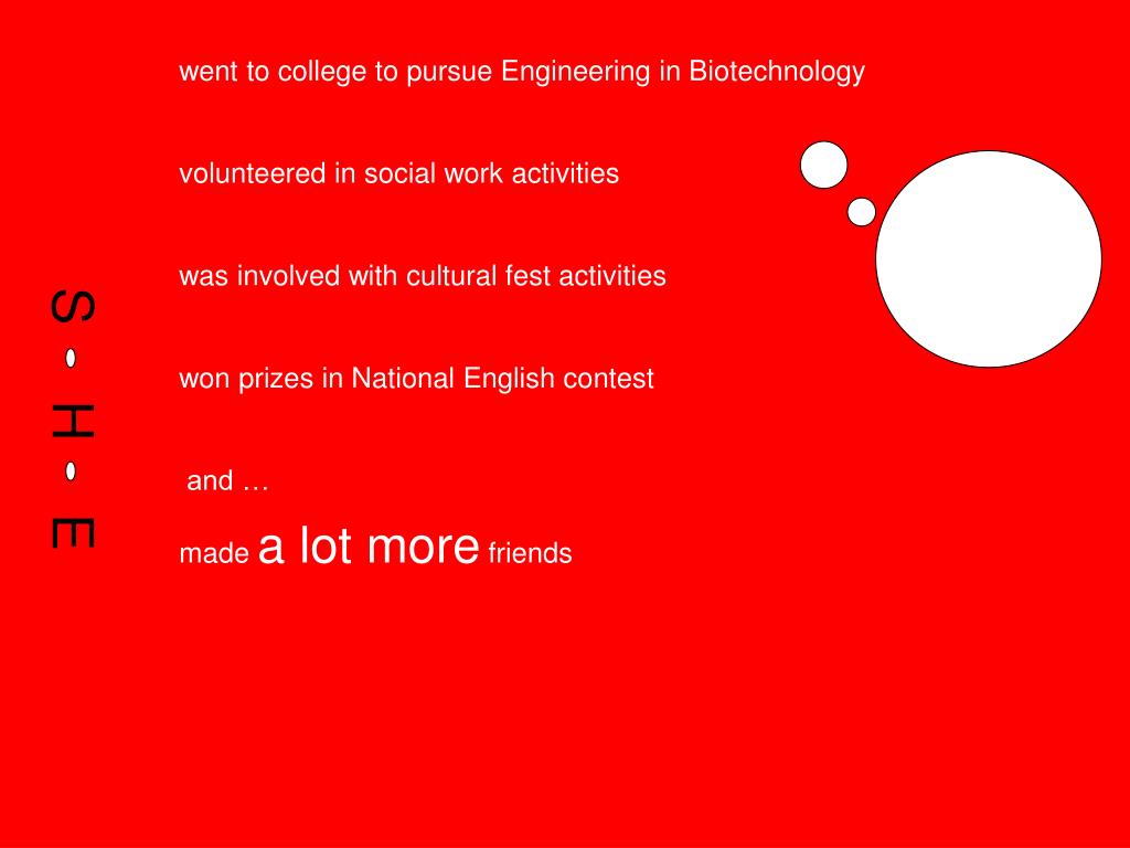 went to college to pursue Engineering in Biotechnology volunteered in social work activities was involved with cultural fest activities won prizes in National English contest and … made a lot more friends S H E