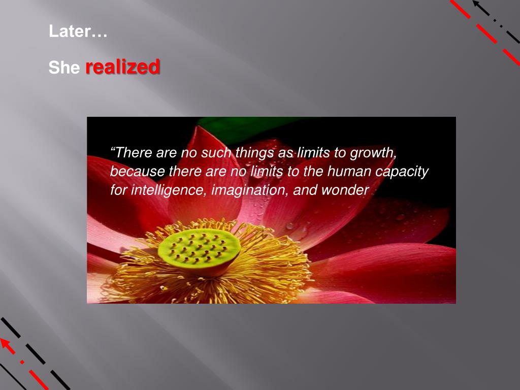 Later… She realized “There are no such things as limits to growth, because there are no limits to the human capacity for intelligence, imagination, and wonder