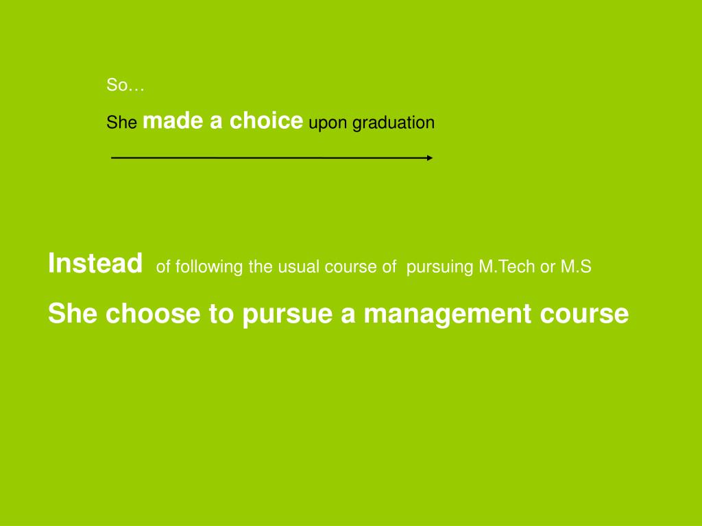 So… She made a choice upon graduation Instead of following the usual course of pursuing M.Tech or M.S She choose to pursue a management course