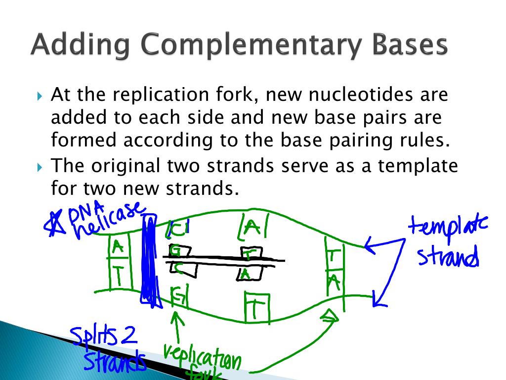 Adding Complementary Bases • At the replication fork, new nucleotides are added to each side and new base pairs are formed according to the base pairing rules. • The original two strands serve as a template for two new strands.