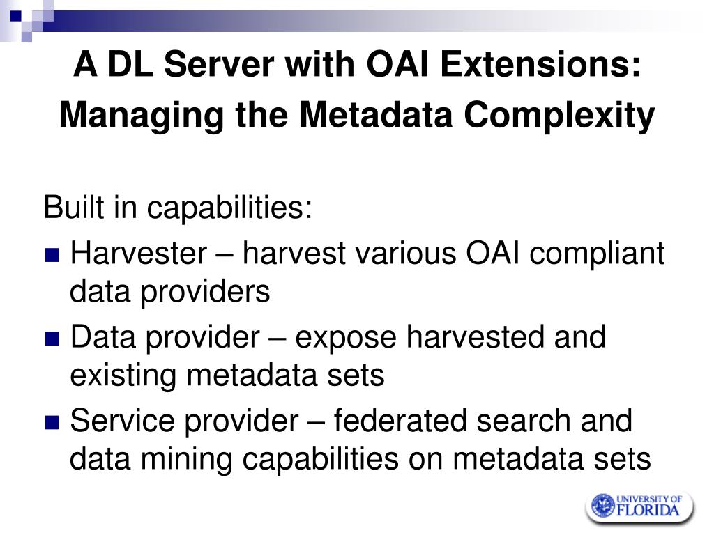 A DL Server with OAI Extensions: Managing the Metadata Complexity Built in capabilities: • Harvester – harvest various OAI compliant data providers • Data provider – expose harvested and existing metadata sets • Service provider – federated search and data mining capabilities on metadata sets