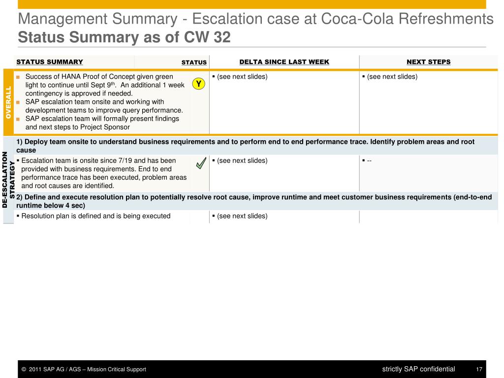 Management Summary - Escalation case at Coca-Cola RefreshmentsOverview of Escalation Case & Overall Status G Y Y R R • MANAGEMENT STATUS SUMMARY on overall situation • Success of HANA Proof of Concept endangered due to suboptimal query performance. • SAP escalation team onsite and working with development teams to improve query performance. • TOP ISSUES in agreement with customer • HANA Performance – In SAP analysis • HANA Stability Issues – Resolved • HANA/Explorer Connectivity – Resolved • EXIT CRITERIA for closing the escalation • SAP has optimized reporting performance of report "global basic report" using all significant optimization potentials • SAP has resolved the reported stability and connectivity issues >
