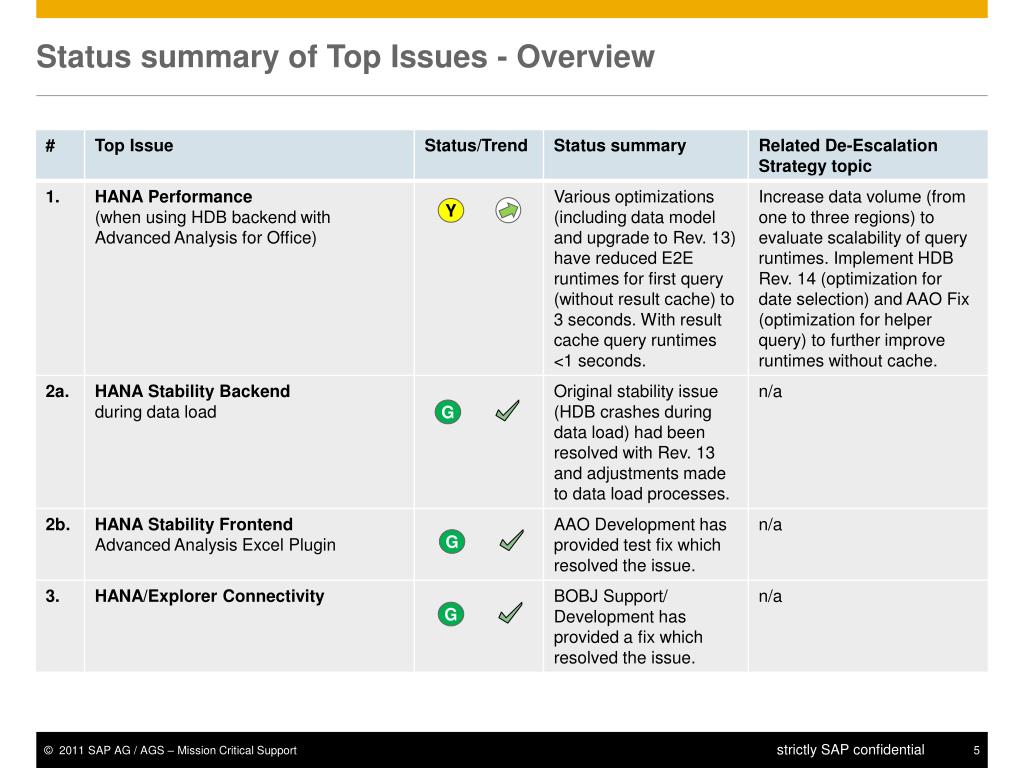 Status Summary Top Issue 1: HANA Performance G R Y R R R R Y
