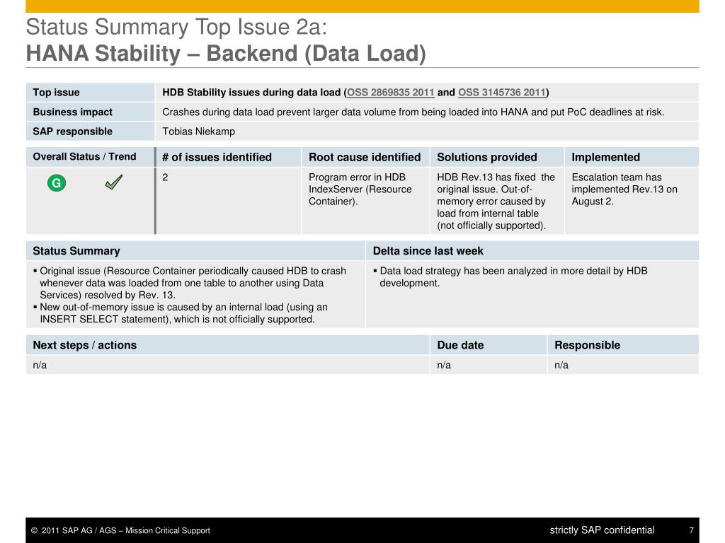 Status Summary Top Issue 2a: HANA Stability – Backend (Data Load) G R Y R R R G