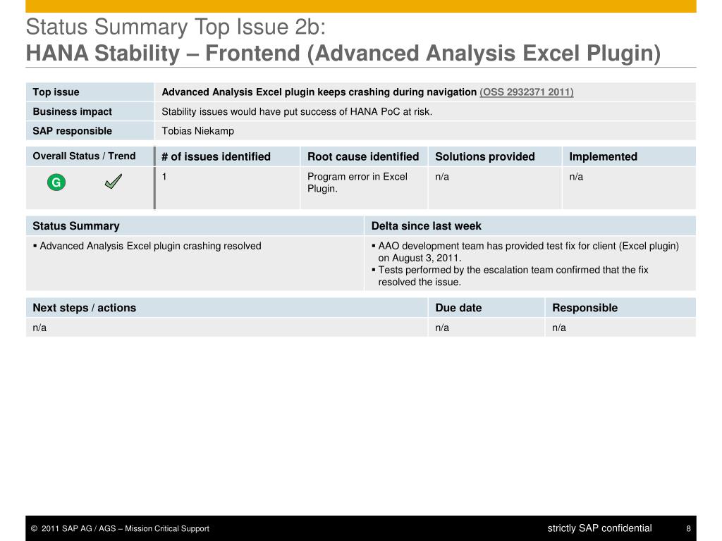 Status Summary Top Issue 2b: HANA Stability – Frontend (Advanced Analysis Excel Plugin) G Y R R G